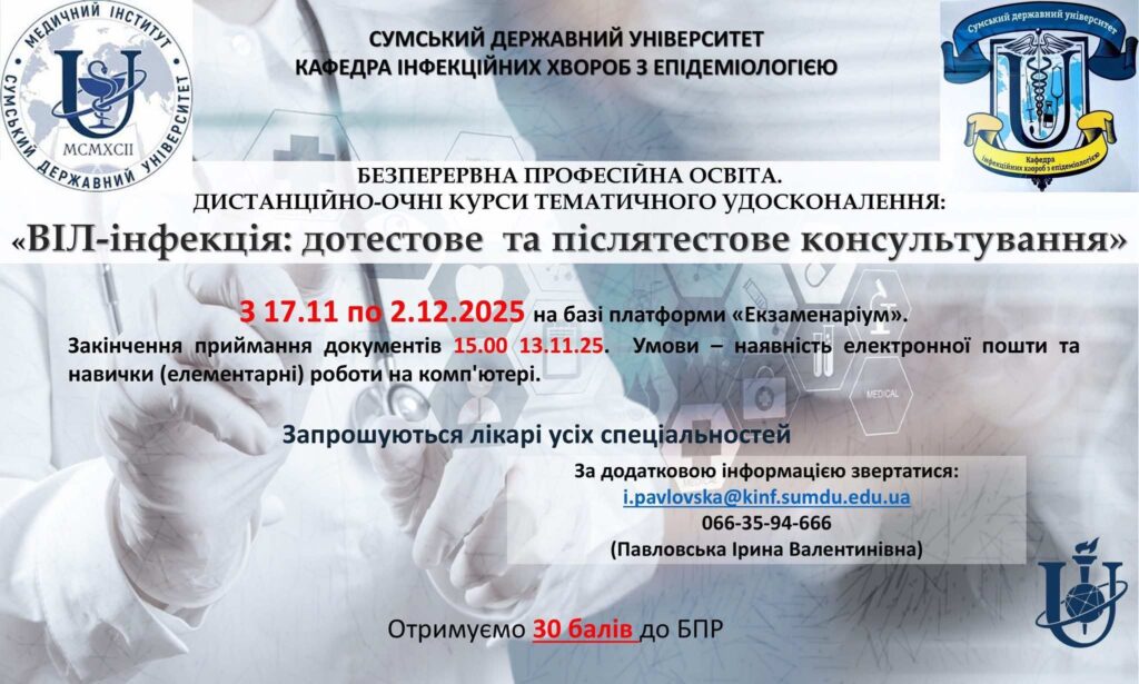 Кафедра інфекційних хвороб з епідеміологією Сумського державного університету запрошує з 17.11 по 2.12.25 на курси ТУ “ВІЛ-інфекція: дотестове та післятестове консультування”. Тривалість 14 днів. Форма занять змішана (дистанційно-очна). Сертифікат по закінченню курсів. 30 балів БПО. Вартість курсів 3000 грн., оплата – до початку курсів. Оплата можлива згідно договору з юридичною особою (лікувальний заклад, ФОП тощо) та з фізичною особою (лікувальний заклад має право компенсувати витрати). Для членів ГО АІС можлива часткова компенсація витрат. Документи необхідні для запису на курси – договір з СумДУ, копія диплома, копія першої та другої сторінки паспорта, чек про оплату. Спілкування через електронну скриньку n.chemych@kinf.sumdu.edu.ua або i.pavlovska@kinf.sumdu.edu.ua.